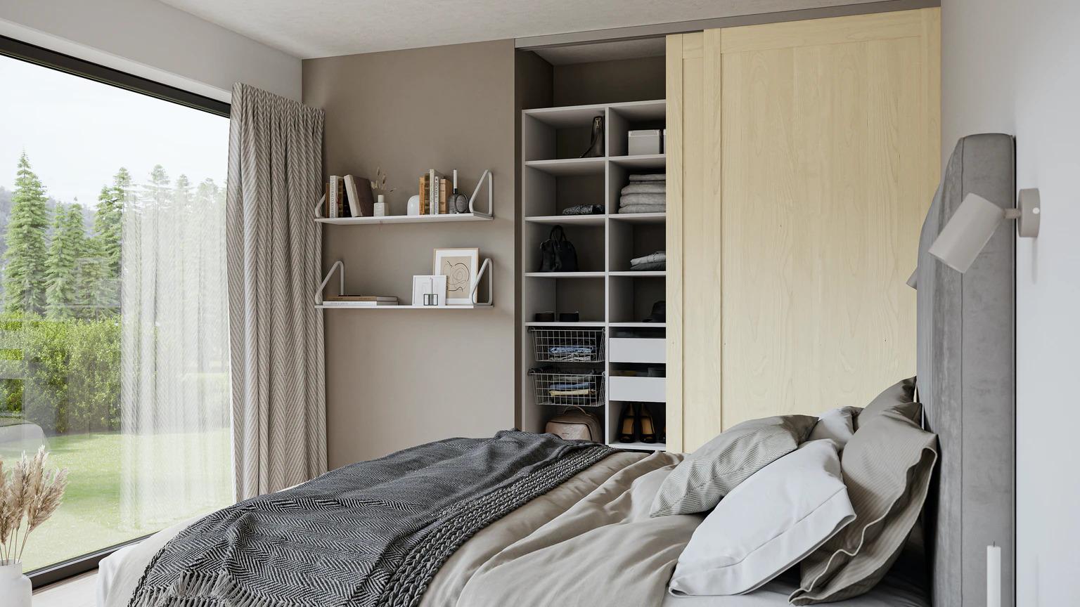 Topaz: To dører med hel fylling i lakkert bjørk. Flexiseksjoner i hvit utførelse. Kombinasjon mellom skuffer, trådkurver, hyller og garderobeoppheng.