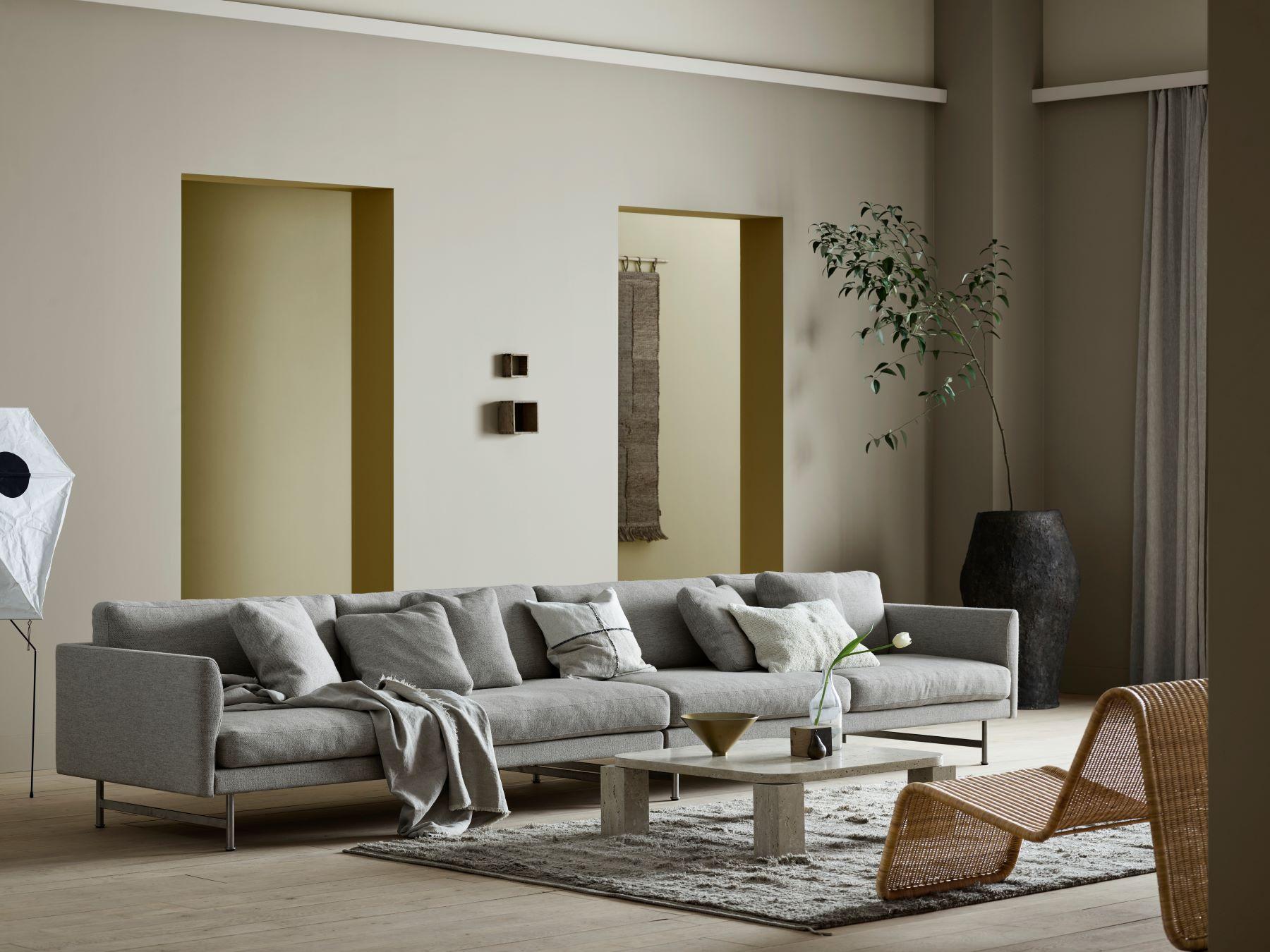 Farger i bildet: Antwerp beige på veggen, soothing beige over listene, earthy yellow på den gule veggen bak og mexico mist på dørkarmene. Foto: Jotun