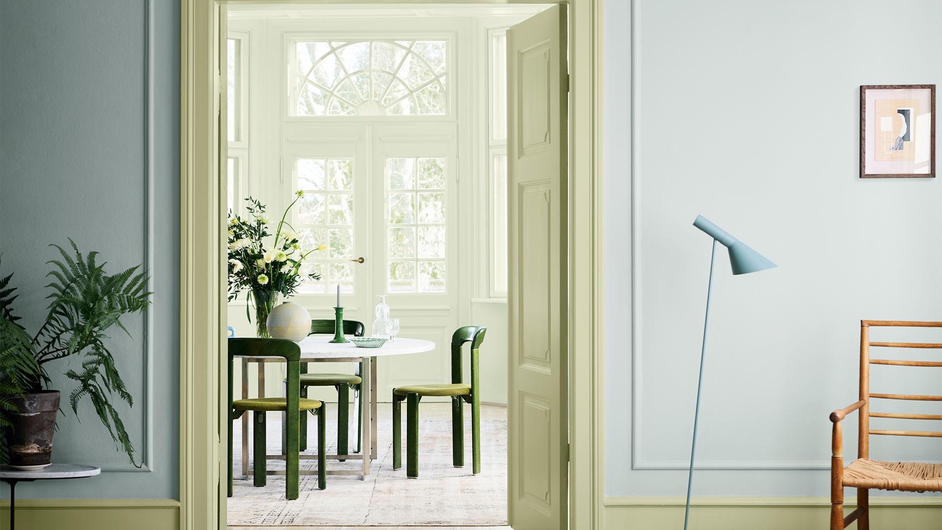 Myke, naturlige grønntoner skaper en rolig og samlende atmosfære, samtidig som de gir rom for mer dristige aksenter og detaljer som skal fremheves. Bakgrunnen danner kulissen som gjør at utvalgte elementer får skinne.