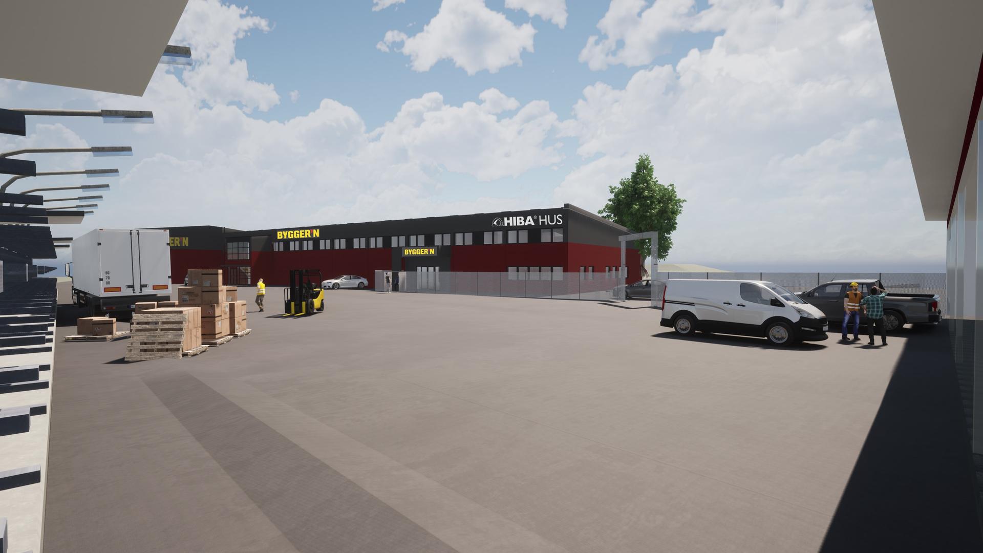 Utendørsarealet utvides og moderniseres med nye lagringssystemer, belysning og gode kjøreområder for både leverandører og kunder. Inngangen til Bygger`n-butikken flyttes til fasaden mot Fanaveien i sørvest, noe som vil gjøre tilgjengeligheten til butikken mye bedre.
