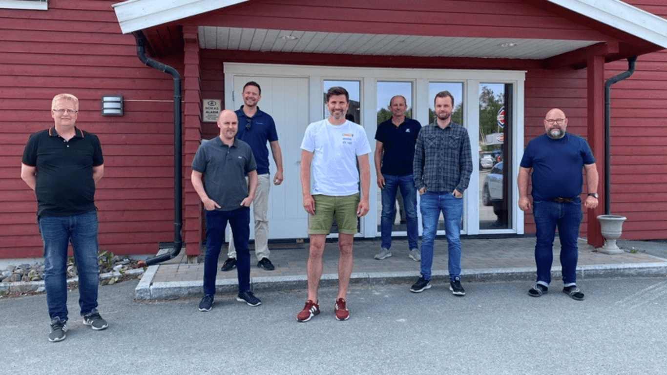 Her er prosjektgruppa samlet utenfor Byggmesterans lokaler i Verdal. Fra Byggmesteran: Lars Petter Sjøvold, daglig leder og Morten Øyen, HMS leder. Fra SINTEF: Sven-Vegard Buer og Lars Skjelstad. Fra Bygger'n; Manuel Fehn, logistikkleder, Christer Matberg, proffselger og Markus Berget, markedsdirektør.