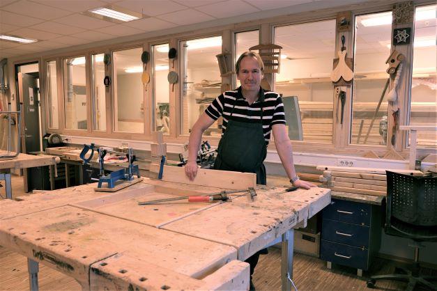 Bygger’n møter Aune i en godt utrustet sløydsal på Flatåsen ungdomsskole i Trondheim, der han har jobbet som kunst og håndverk-lærer i sju år.